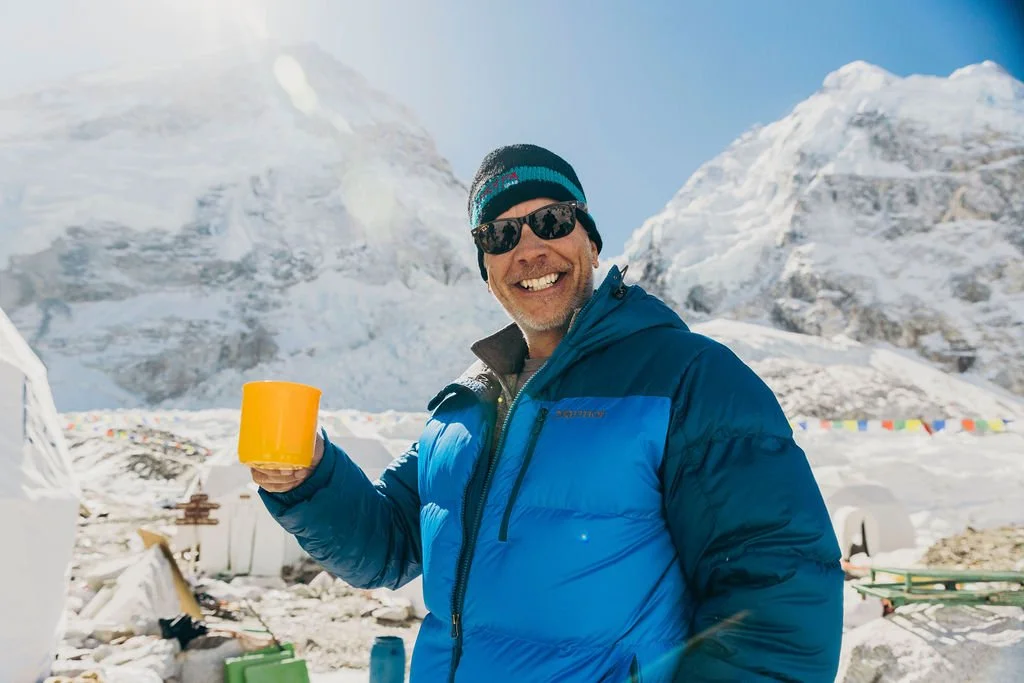 A Rugged Luxury guest wearing sunglasses, a blue jacket, and a winter hat, holding a yellow mug, smiling in a snowy mountain landscape at the Climbing the Seven Summits Everest Base Camp.