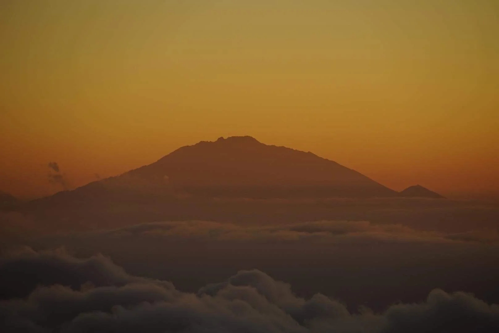 Far above the savannas of northern Tanzania, Kilimanjaro rises through the clouds, a snow-capped sentinel standing watch over the vast African horizon.