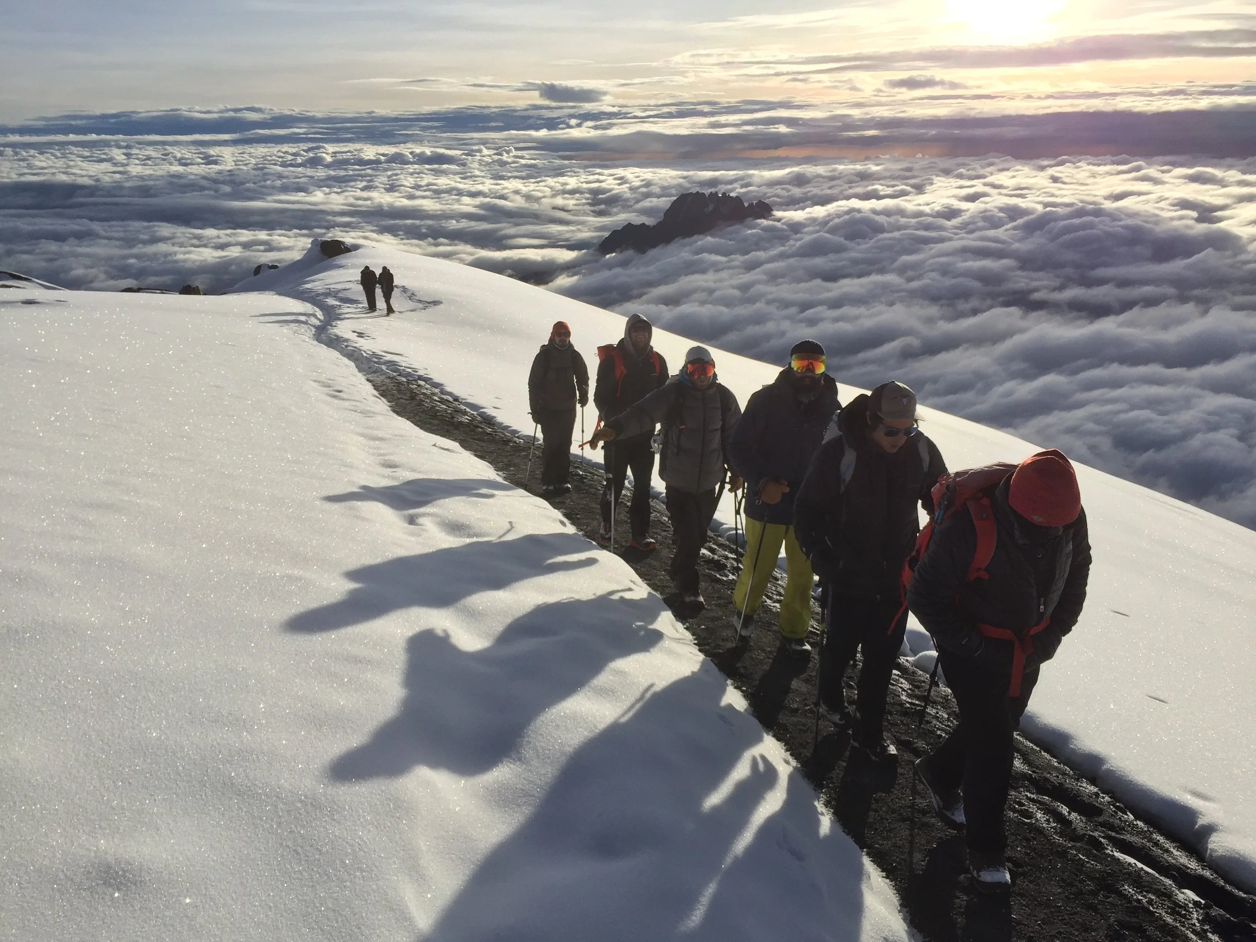 You’ll reach Stella Point (18,652 ft / 5,685 m) on the crater rim at dawn, just as the sun rises over Mawenzi Peak and the Tanzanian plains. The final stretch to Uhuru Peak (19,341 ft / 5,895 m), Africa’s highest point, follows the crater rim as you walk above the clouds.