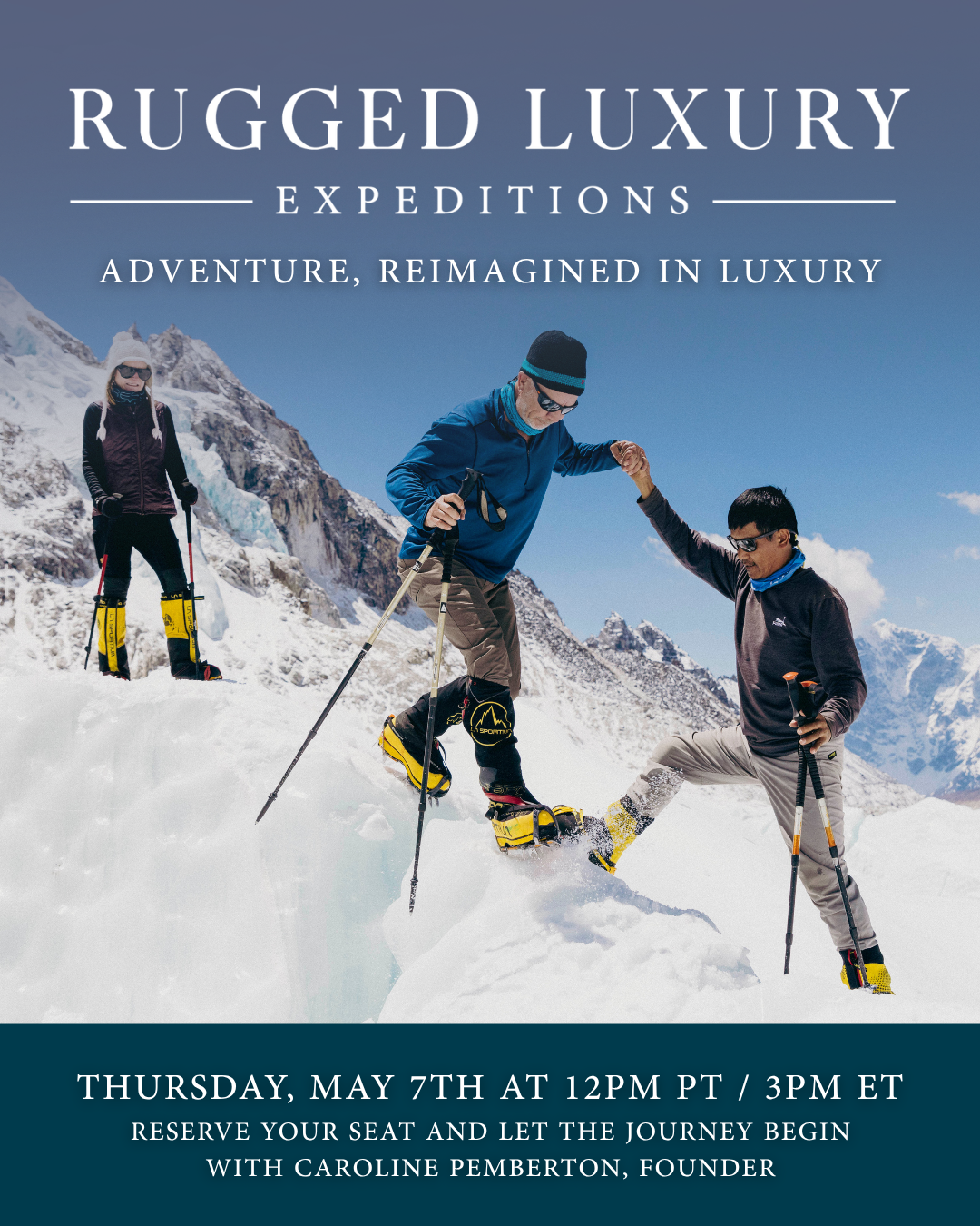 In this webinar, Caroline will walk through exactly what the Rugged Luxury difference looks like in the field: the camps, the food, the guides, the cultural moments, the champagne, and the questions most people don't think to ask until they're already packing. Whether you're a seasoned climber wondering how to tempt your people to join or someone who has always wanted to go but has been put off by the suffer-fest of roughing it day after day, this webinar is for you.
